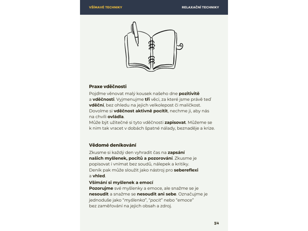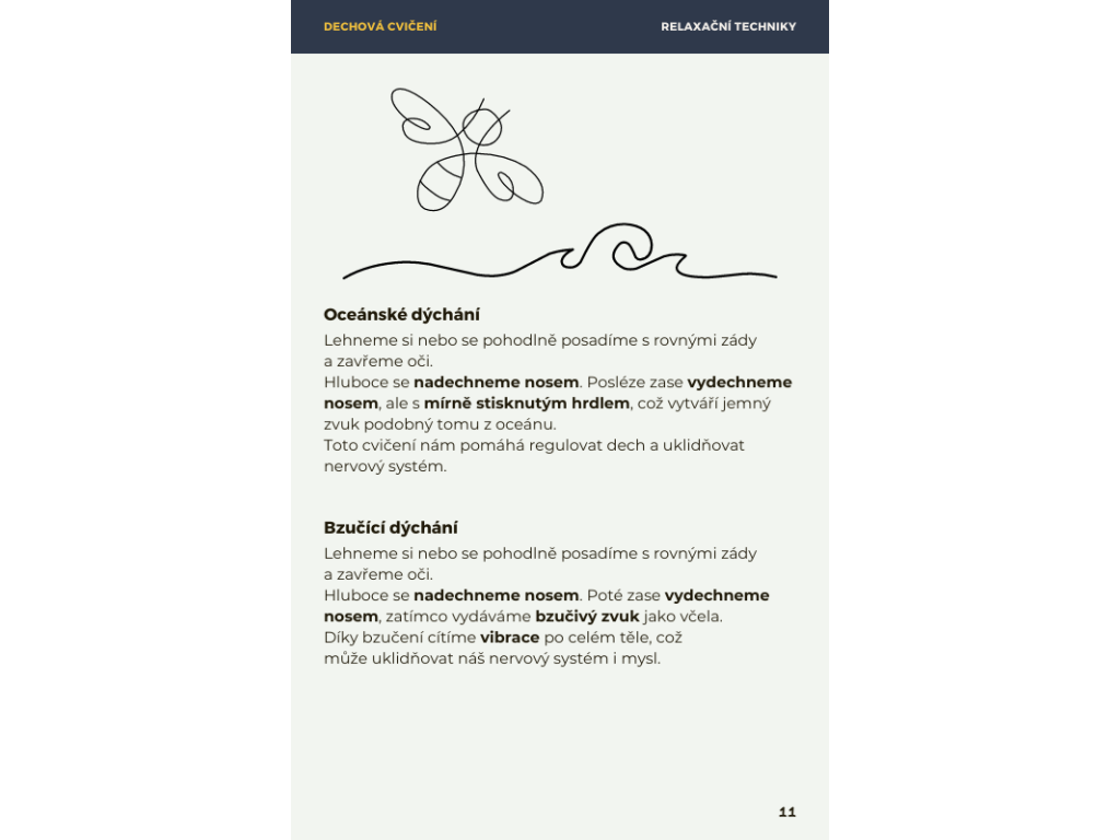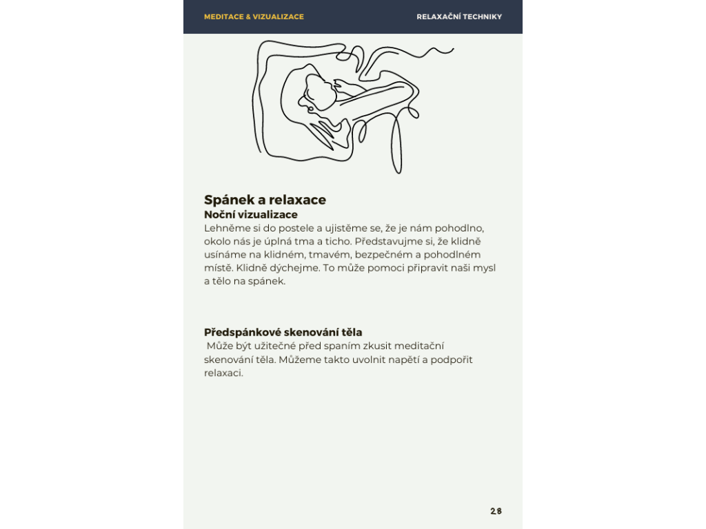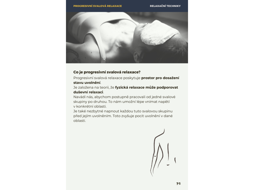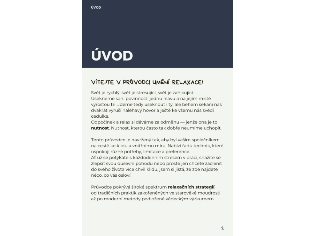 Odpočinek a relax si dáváme za odměnu — jenže ona je to nutnost. Nutnost, kterou často tak dobře neumíme uchopit. Tento průvodce vám přijde na e-mail ve formě jednoho pdf souboru ke stažení. Je navržený tak, aby byl vaším společníkem na cestě ke klidu a vnitřnímu míru. Nabízí řadu technik, které uspokojí různé potřeby, limitace a preference. Každá kapitola je věnována konkrétní technice a ukazuje konkrétní metody, nápady a tipy, jak ji užívat i v praxi.